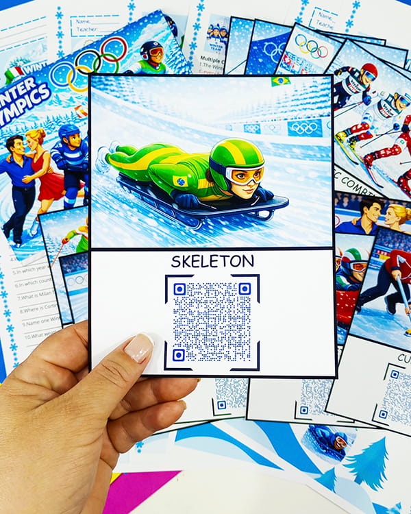 Flashcards com os principais esportes olímpicos de inverno, trazendo imagens modernas e vocabulário em inglês, ideais para trabalhar reconhecimento visual, ampliação de vocabulário e engajamento de alunos teens em sala de aula.