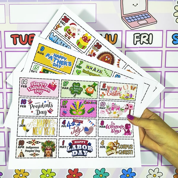😃 Cartões com diversas datas comemorativas para aplicar nos dias correspondentes.