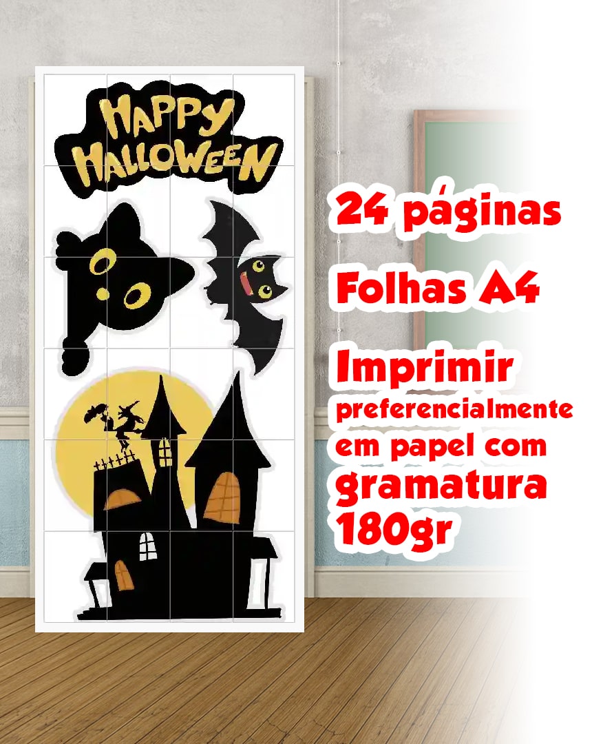 🎨 Ilustrações exclusivas: gato preto, morcego, bruxa, castelo e o letreiro “Happy Halloween”.